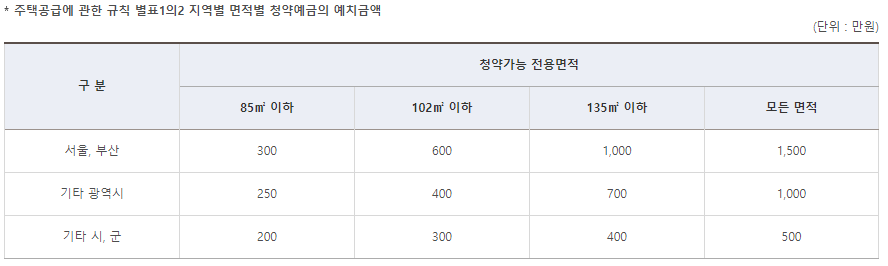 또한 예치금은 아래 표와 같으며, 예치금액 이하의 주택에 대해서는 자유롭게 청약을 허용합니다.